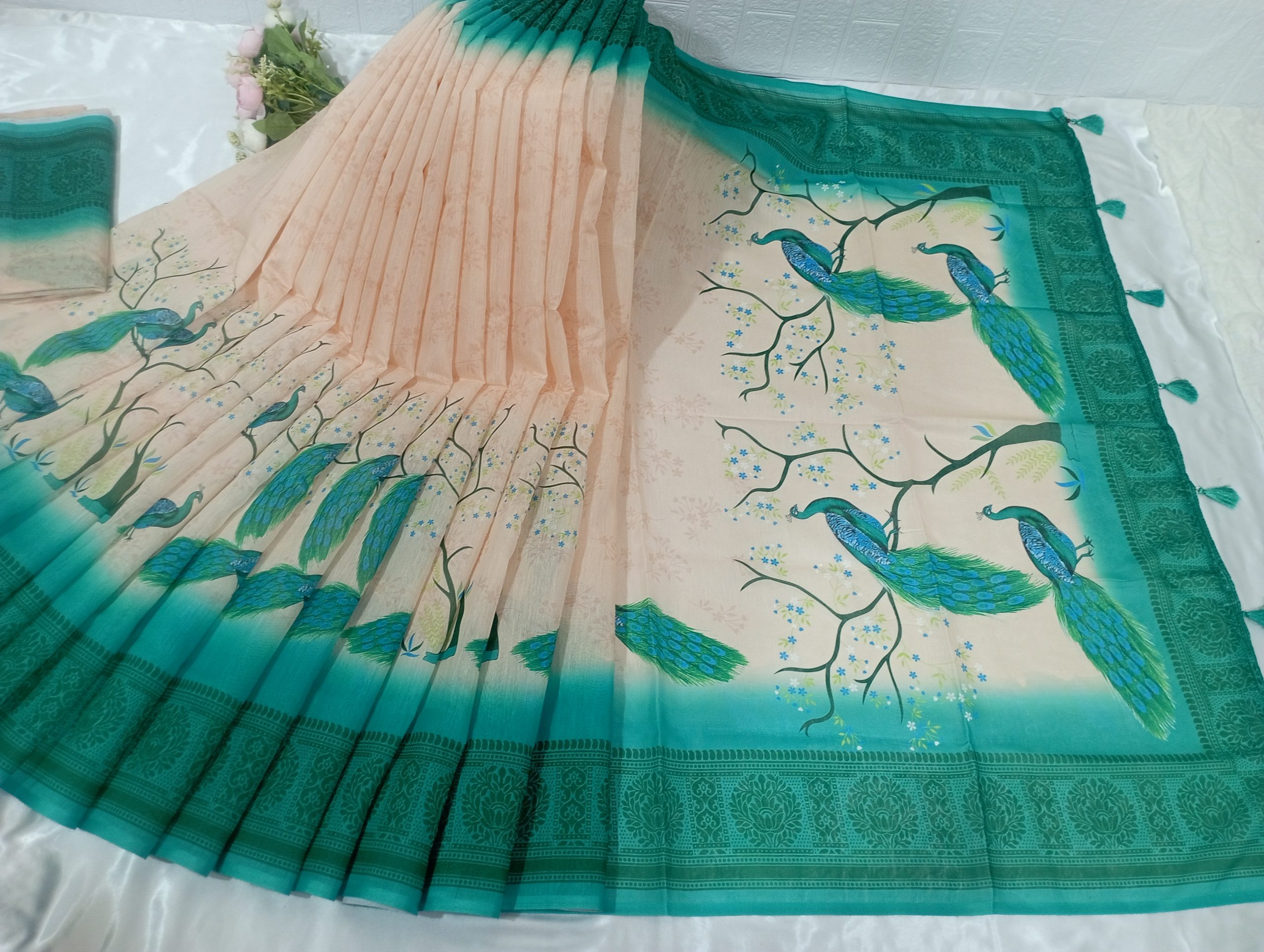 ময়ুর প্রিন্ট চান্দেরি সিল্ক শাড়ি (ব্লাউজ পিসসহ)